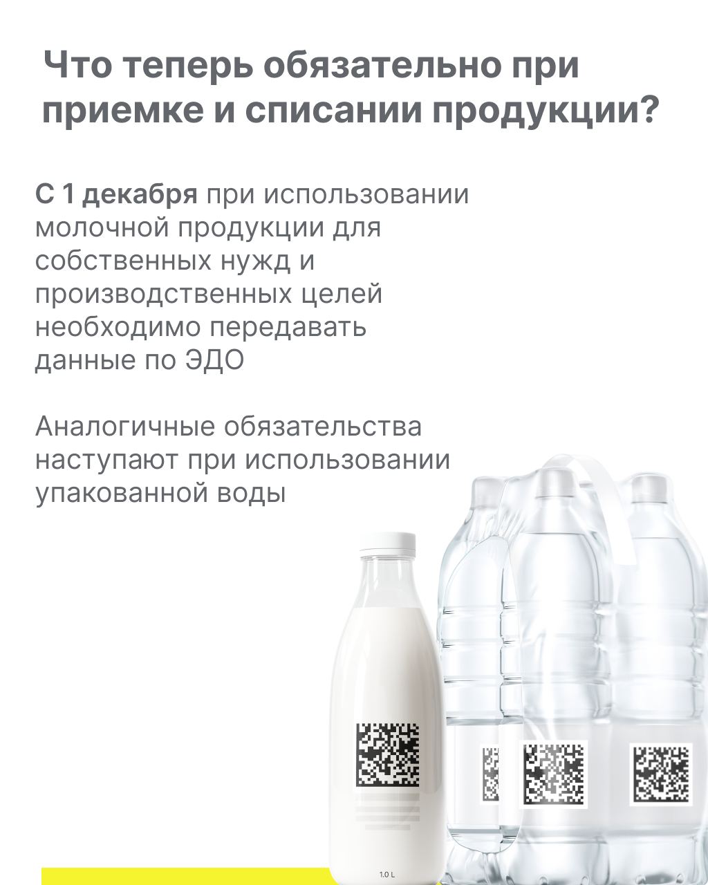 С 1 декабря 2023 г. становится обязательной передача сведений в систему маркировки «Честный знак» об обороте и выводе из оборота молочной продукции. Аналогичные обязательства наступают при использовании упакованной воды.